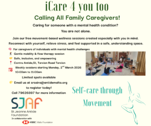 St.Jeanne Antide Foundation will be organising A new iCare4U wellness group. The programme offers free weekly movement and dance therapy sessions designed to help family caregivers reduce stress, express themselves, and enjoy a supportive space focused on their own well-being. Limited places available. If you or someone you know may benefit, please get in touch with us via private message or email ...