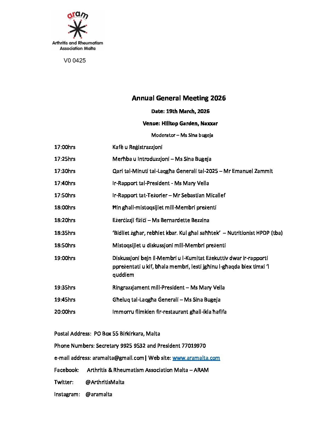 ARAM will be organising their annual general meeting being held on the 19th March 2026 between 5.00pm and 7.30pm. This will be followed by a light lunch at a cost of 30 euros pp. Welcome coffee/tea and 1 glass of wine or drink included.
