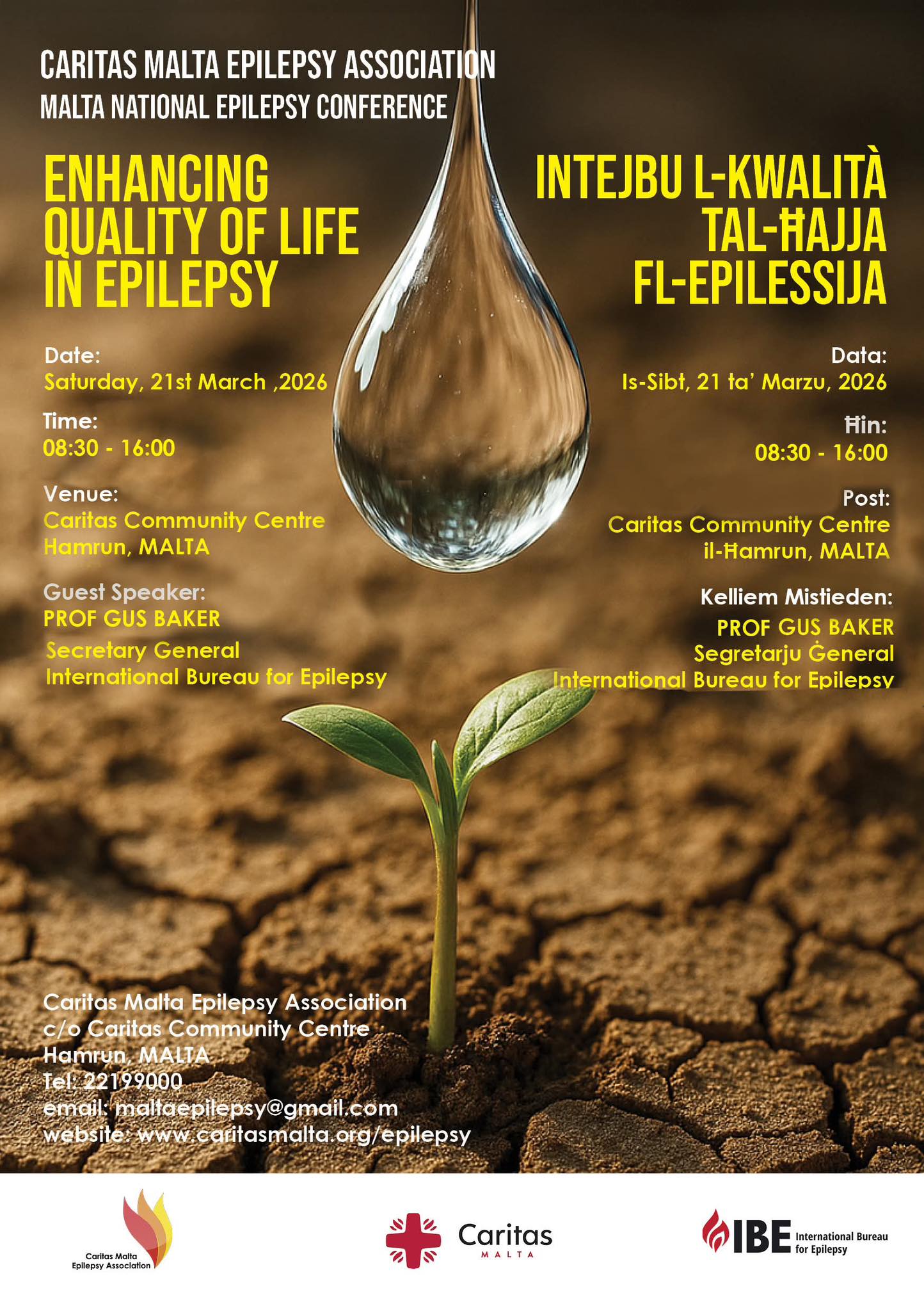 « All Events Enhancing quality of life in Epilepsy 21 March, 8:30 am - 4:00 pm Free « Transforming Health Through Patient Empowerment: Health Digilization Caritas Epilepsy Malta are organising a conference titled: Enhancing quality of life in Epilepsy. Date; 21st March 2026 Time:08.30-16:00 Venue: Caritas Community Centre Hamrun + Google Calendar+ iCal Export Details Date: 21 March Time: 8:30 am - 4:00 pm Cost: Free