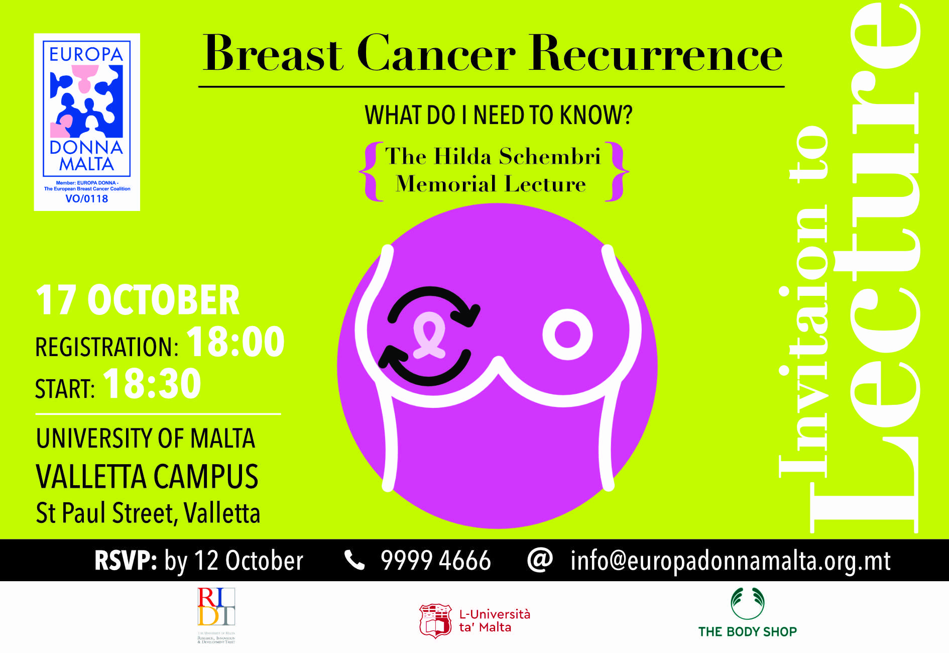 Europa Donna Malta will be organising again The Hilda Schembri Memorial Lecture, with the theme: Breast Cancer Recurrence -What do I need to know?