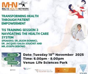 Malta Health Network is holding Training sessions for members of member organisations, patients, care-givers, professionals and the general public, with the theme: Transforming Health Through Patient Empowerment. The 3rd Session of this training will be held on the 18th November 2025 with the theme: Navigating The Health Care System The speakers for this session will be: Dr. Jason Bonnici, Dr. Jacques Galea Souchet and Mr.Joseph Debono Parking will be provided as well. Date: Tuesday 18th November 2025 Time: 6.00pm till 8.00pm…