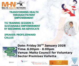 Malta Health Network is holding Training sessions for members of member organisations, patients, care-givers, professionals and the general public, with the theme: Transforming Health Through Patient Empowerment. The 5th Session of this training will be held on the 30th January with the theme: Sustainable Empowerment by becoming an advocate. The speaker for this session will be: Profs. Edward Callus Date: Friday 30th January 2026 Time: 6.00pm till 8.00pm Venue: Life Sciences Park San Gwann Registration starts at: 6.00pm Entrance Fee: Free…