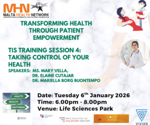 Malta Health Network is holding Training sessions for members of member organisations, patients, care-givers, professionals and the general public, with the theme: Transforming Health Through Patient Empowerment. The 4th Session of this training will be held on the 6th January 2026 with the theme: Taking Care of your Health The speakers for this session will be: Ms. Mary Vella, Dr. Elaine Cutajar, Dr. Mariella Borg Buontempo Parking will be provided as well. Date: Tuesday 6th January 2026 Time: 6.00pm till 8.00pm…