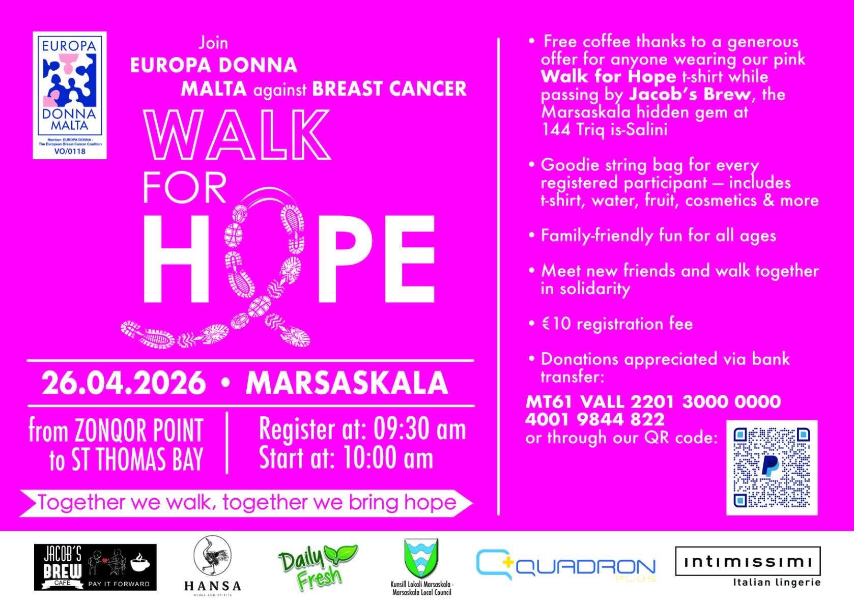 « All Events Walk for Hope 26 April, 9:30 am - 11:00 am « Talk by Karl Vella Foundation: Using Art in therapeutic sessions ASLP CPD talk: Singing and Autism » Europa Donna are organising a walk for hope Details: Date: 26th April 2026 Time: 9.30am Place: Zonqor Point Marsascala + Google Calendar+ iCal Export Details Date: 26 April Time: 9:30 am - 11:00 am